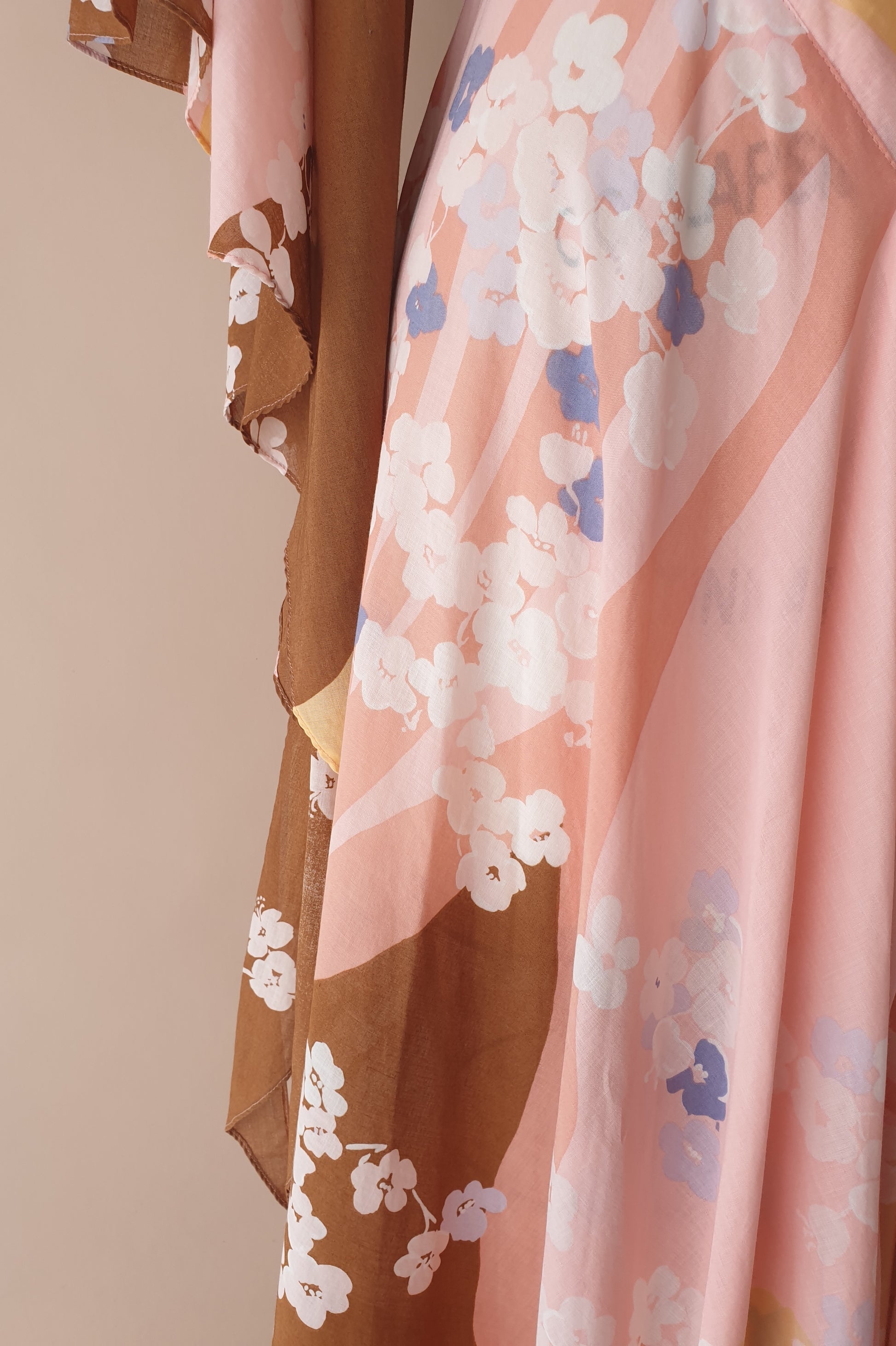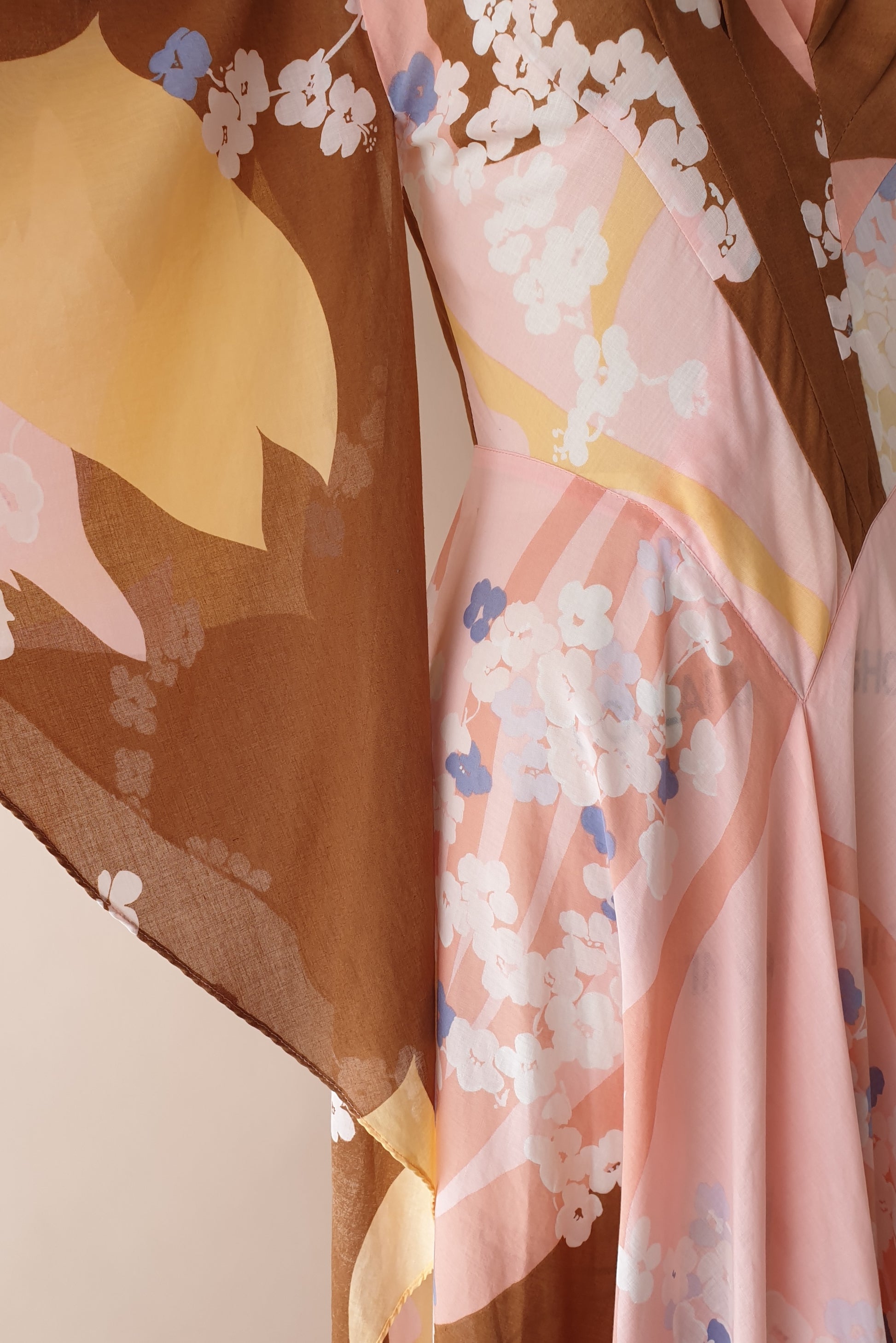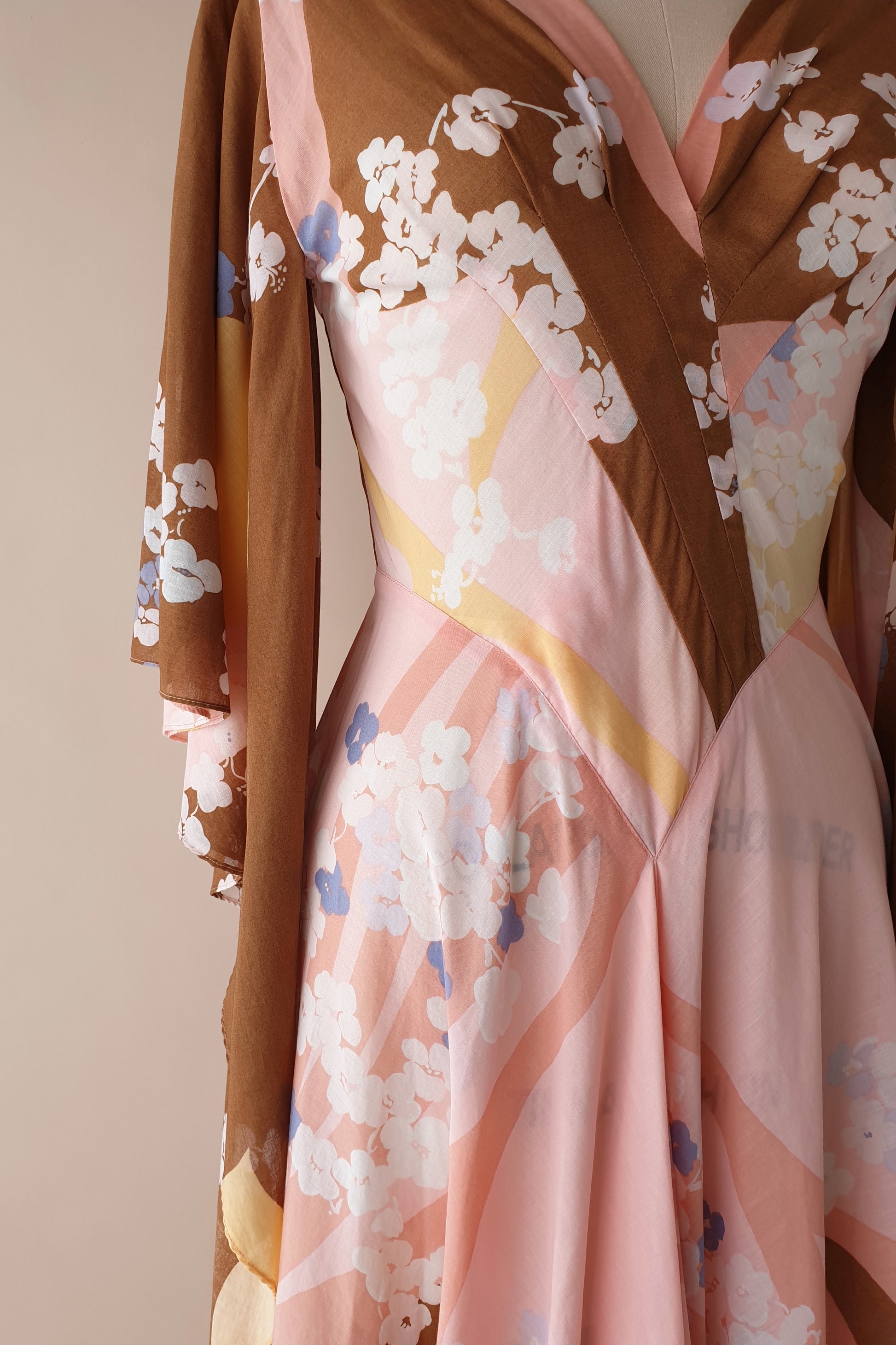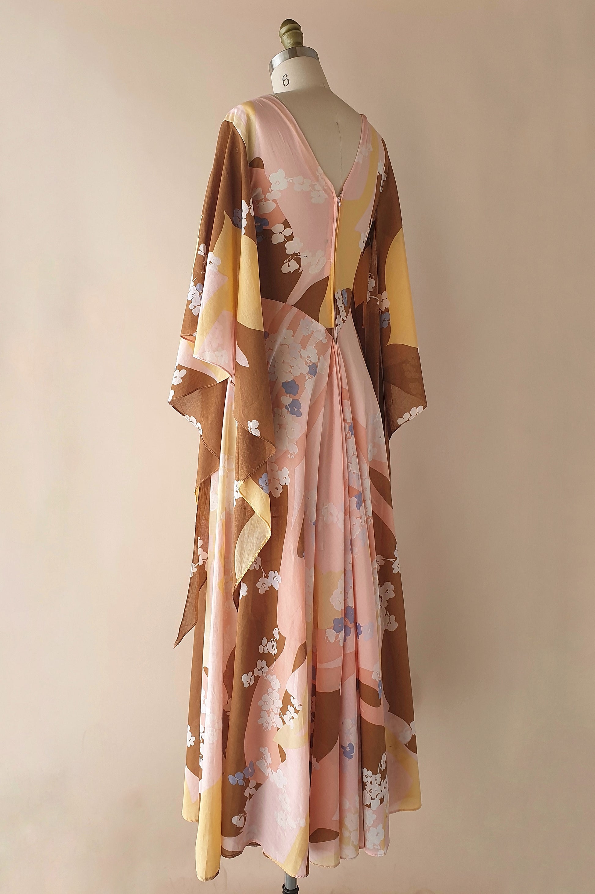 Absolutely stunning vintage soft pink floral maxi dress. Fitted, pleated bodice with a V neckline flowing into a full bias cut skirt that is so beautifully swishy!! Amazing butterfly sleeves. Zip closure at back. Simply breathtaking!!