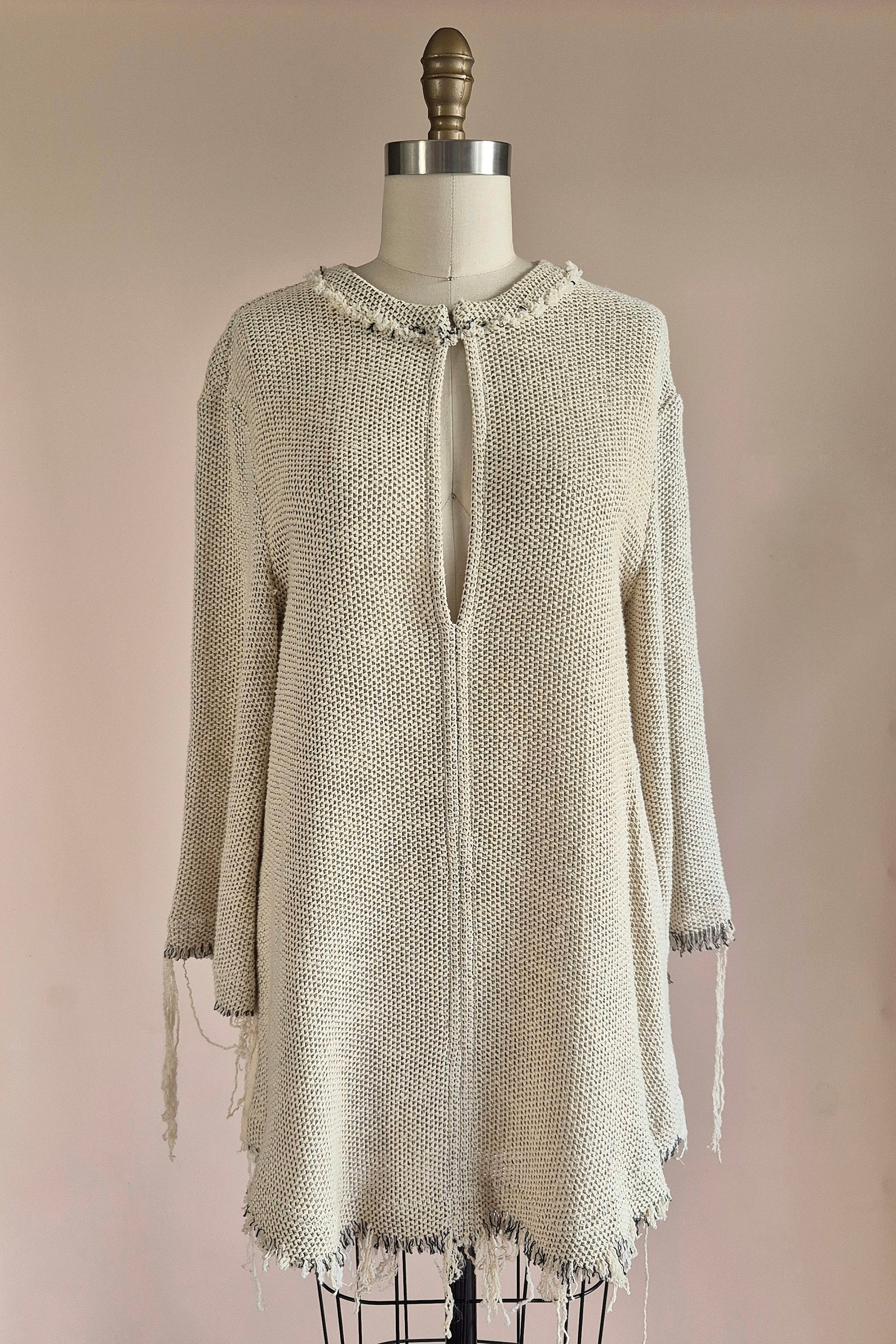 Fabulous knit tunic from IRO. Featuring wonderful frayed edge detail on neckline, hem and sleeves. Keyhole opening at front with hook and eye fastening (The keyhole is quite long so you may need to have a layer underneath) A truly fabulous piece!