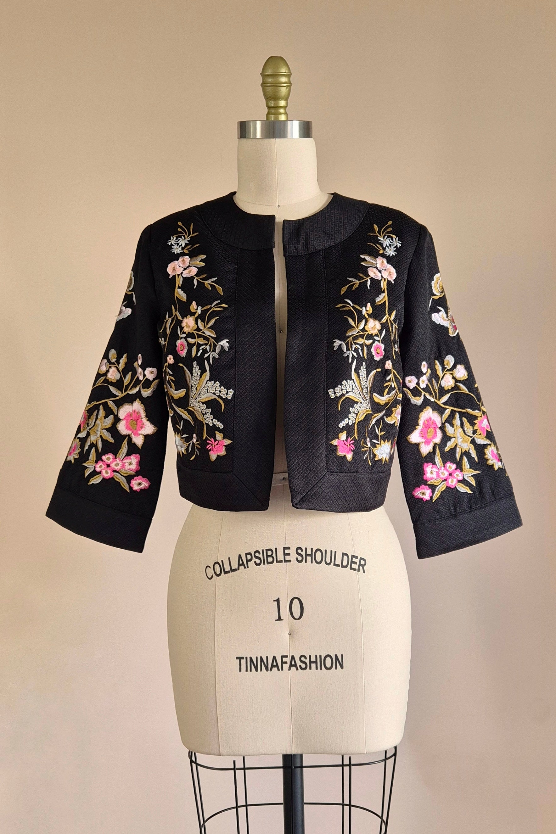 Beautiful black bolero jacket with floral embroidered detail. Three quarter, subtle kimono style sleeve. No closure, designed to be worn open. Fully lined. Wear with a dress for a special event or layer with pants for an everyday look with a dash of wow factor. Label is 'Darling London'.