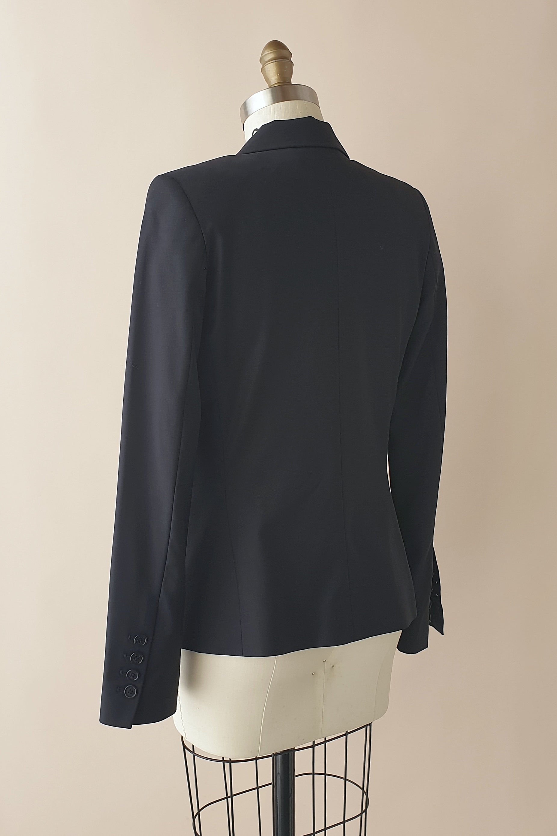 Beautiful navy blazer from French label Paul + Joe. Fabricated from a lovely light suiting wool. Features 1 button closure with coordinating buttons at cuff. Two welt pockets A classic piece you will be wearing for years to come!
