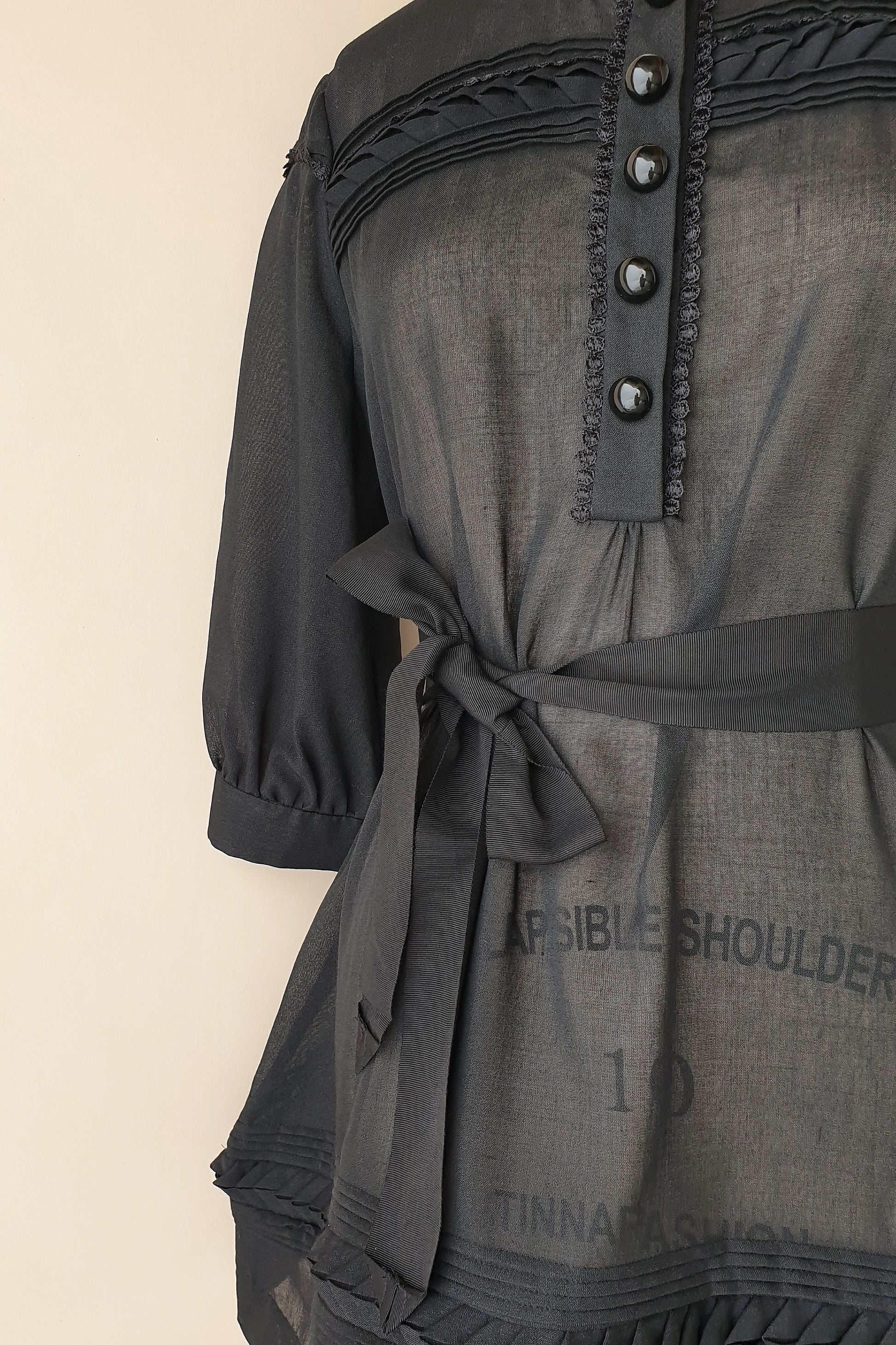 Absolutely stunning black sheer mini dress with amazing braided details. Gently fitted through shoulders and bust then straight cut through the body. Designed to be cinched in at the waist with the coordinating grosgrain tie belt. Five button closure at front. A truly fabulous little dress!