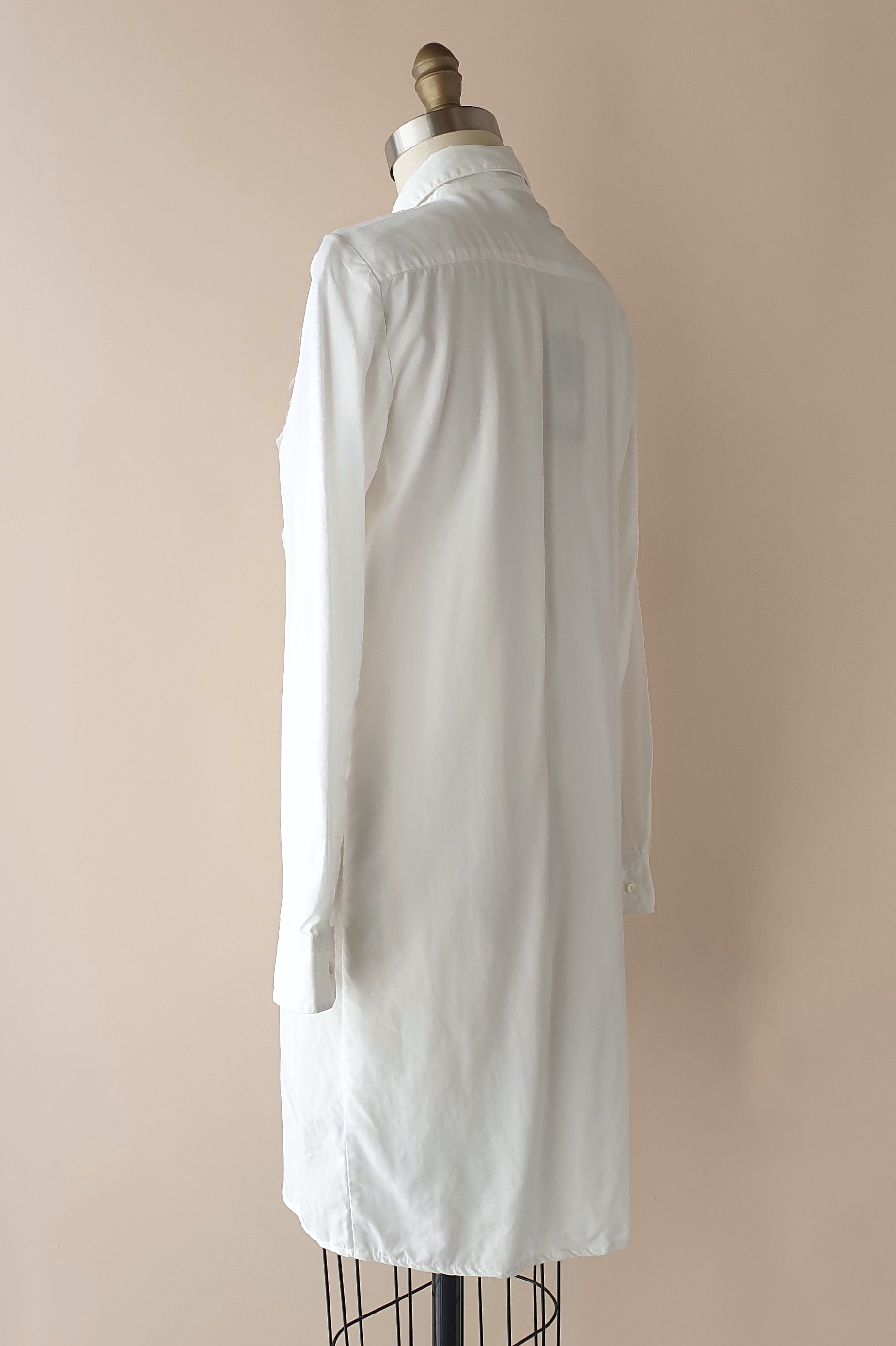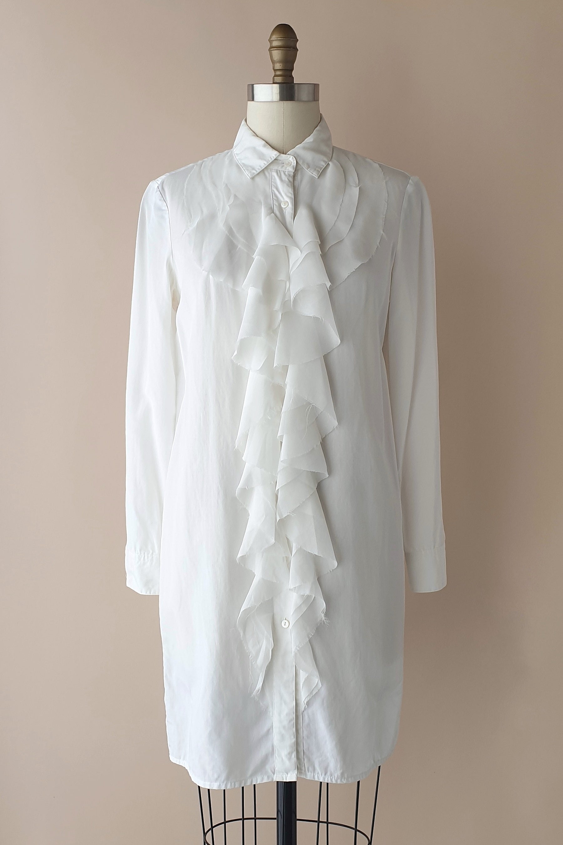 Classic longline white shirt embellished with soft, floaty ruffles. Fitted at shoulders then cut straight through the body, button closure at front. Style with straight leg pants and boots, as a dress with a slip underneath or wear it open!