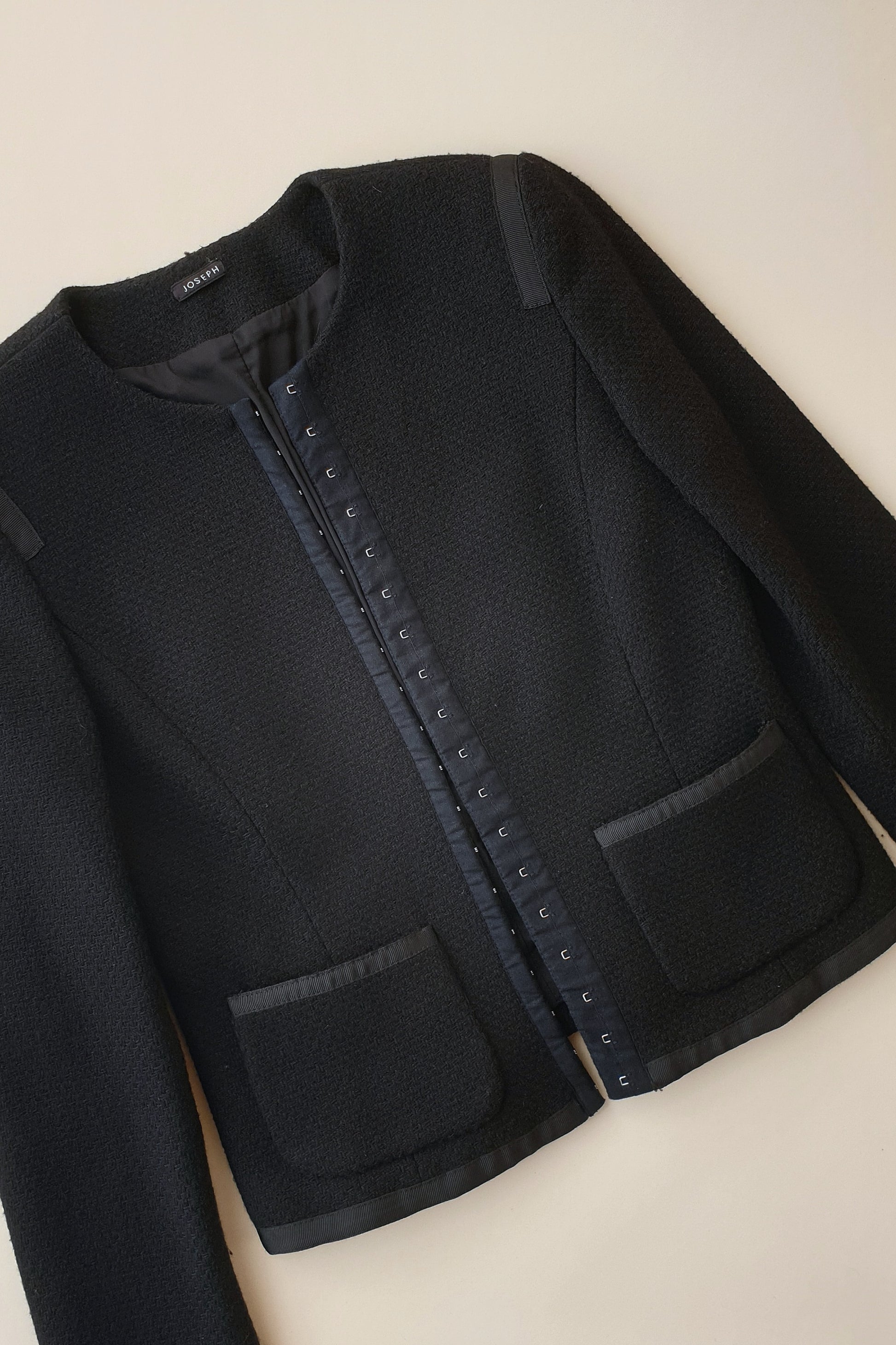 Beautiful fitted wool jacket by designer label Joseph. Lovely textured wool with grosgrain ribbon detailing. Hook and eye closure at front and cuffs adding an edgy feel to this classic style. Two patch pockets at front, fully lined. A wonderful addition to your Winter wardrobe.