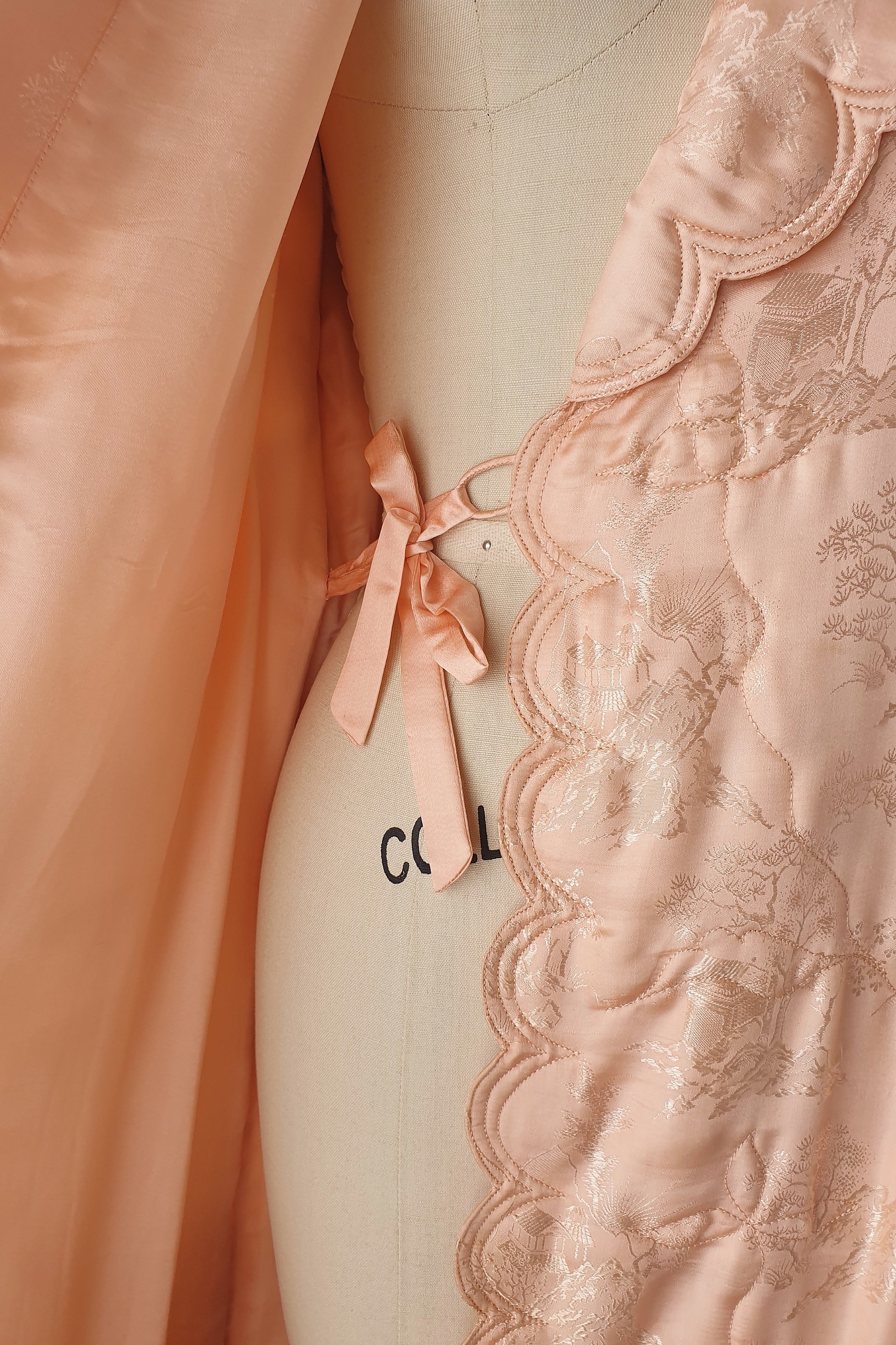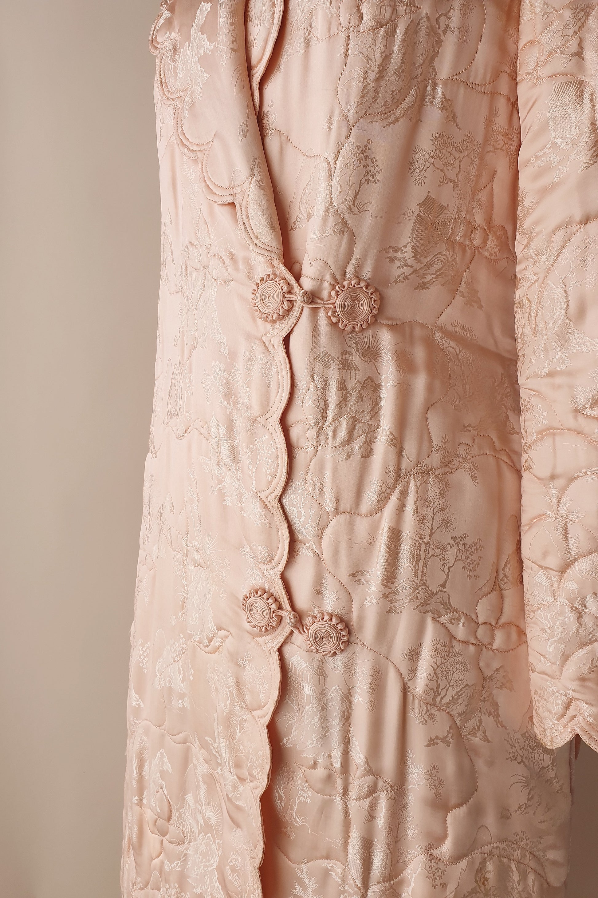 Incredible vintage silk dressing gown. Softly quilted, scalloped hem, fully lined. Fixes inside with a loop and tie and outside with two toggles and a belt to cinch in the waist. You would be hard pressed to find a more beautiful dressing gown although we think it would be an amazing coat too!