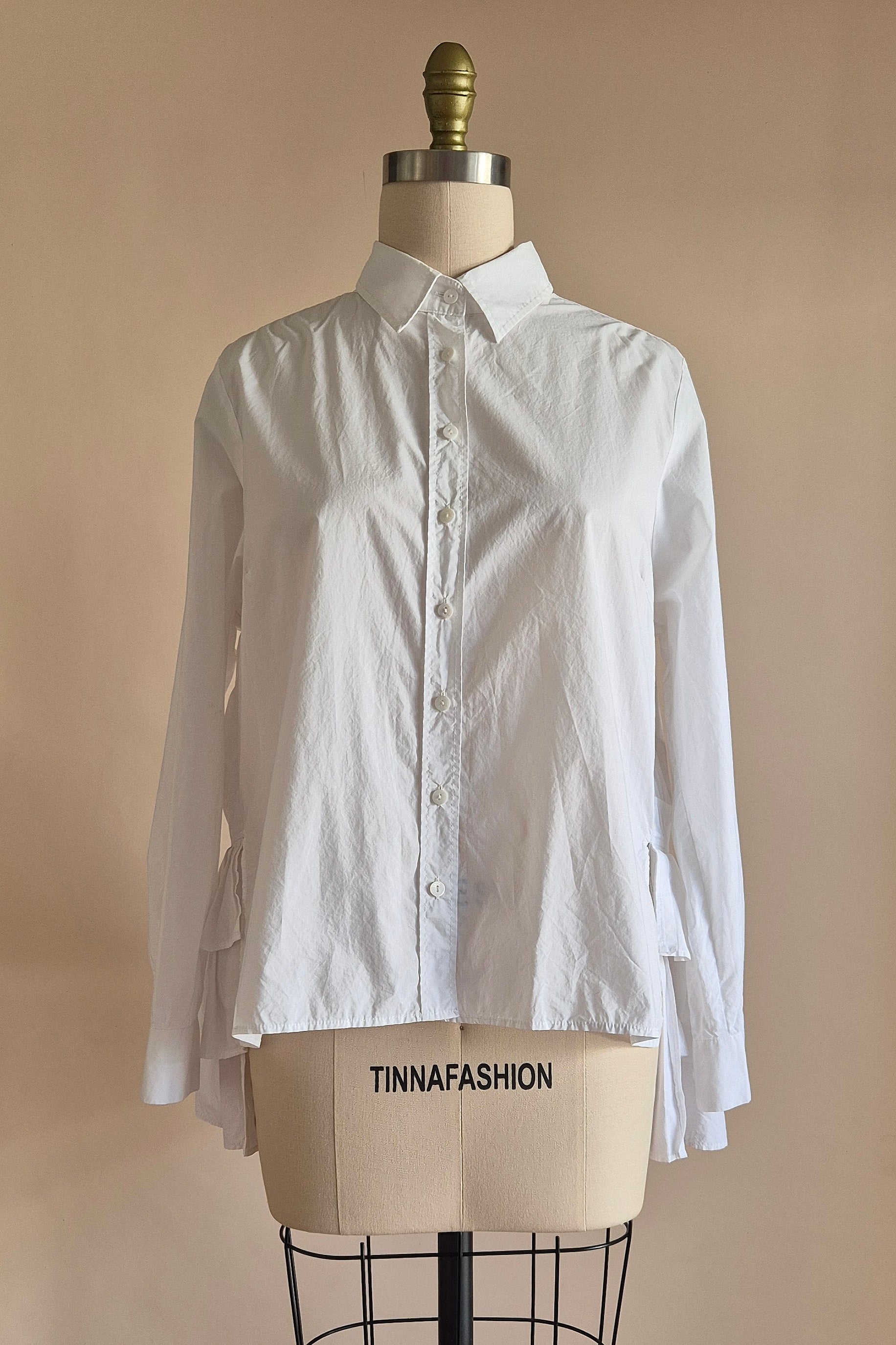 This white cotton ruffled shirt is a charming blend of classic and whimsical style. Crafted from crisp, breathable cotton, it features a button closure at front and splits at the side. It is cut straight and boxy through the body ensuring comfort and ease of movement, while the fabulous ruffles provide drama at the back.