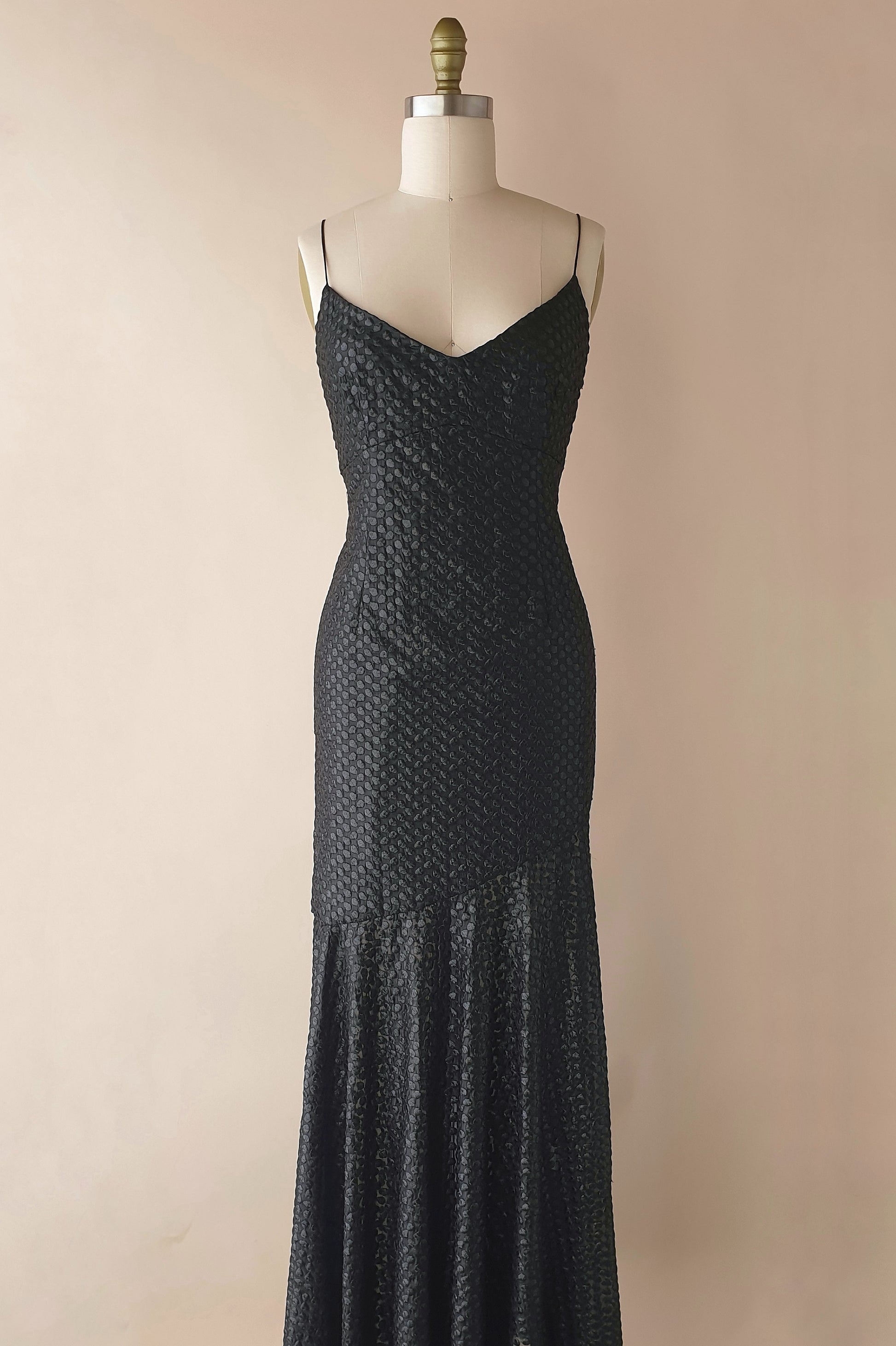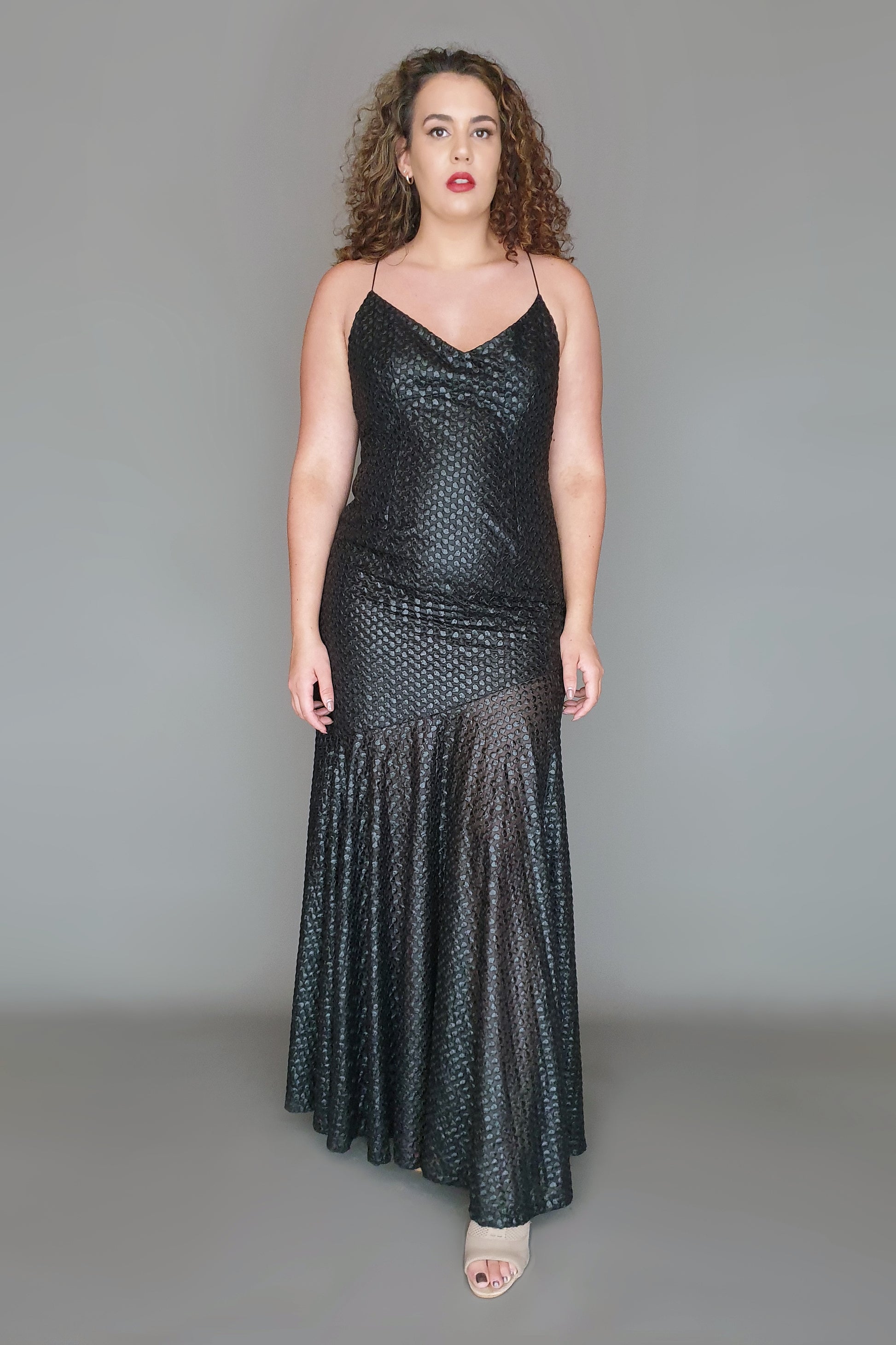 Show stopping Lisa Ho gown. Incredible sheer fabric with embroidered dot print, metallic sheen and heavy drape. Lined through the bodice to the upper thigh then sheer drape through the skirt on an angle. Completely open back to the waist with fine cross over spaghetti straps. Small invisible zip at back. There is no doubt this beauty will make you feel sexy, powerful and glamorous. You are guaranteed to make an entrance in this head turning gown!