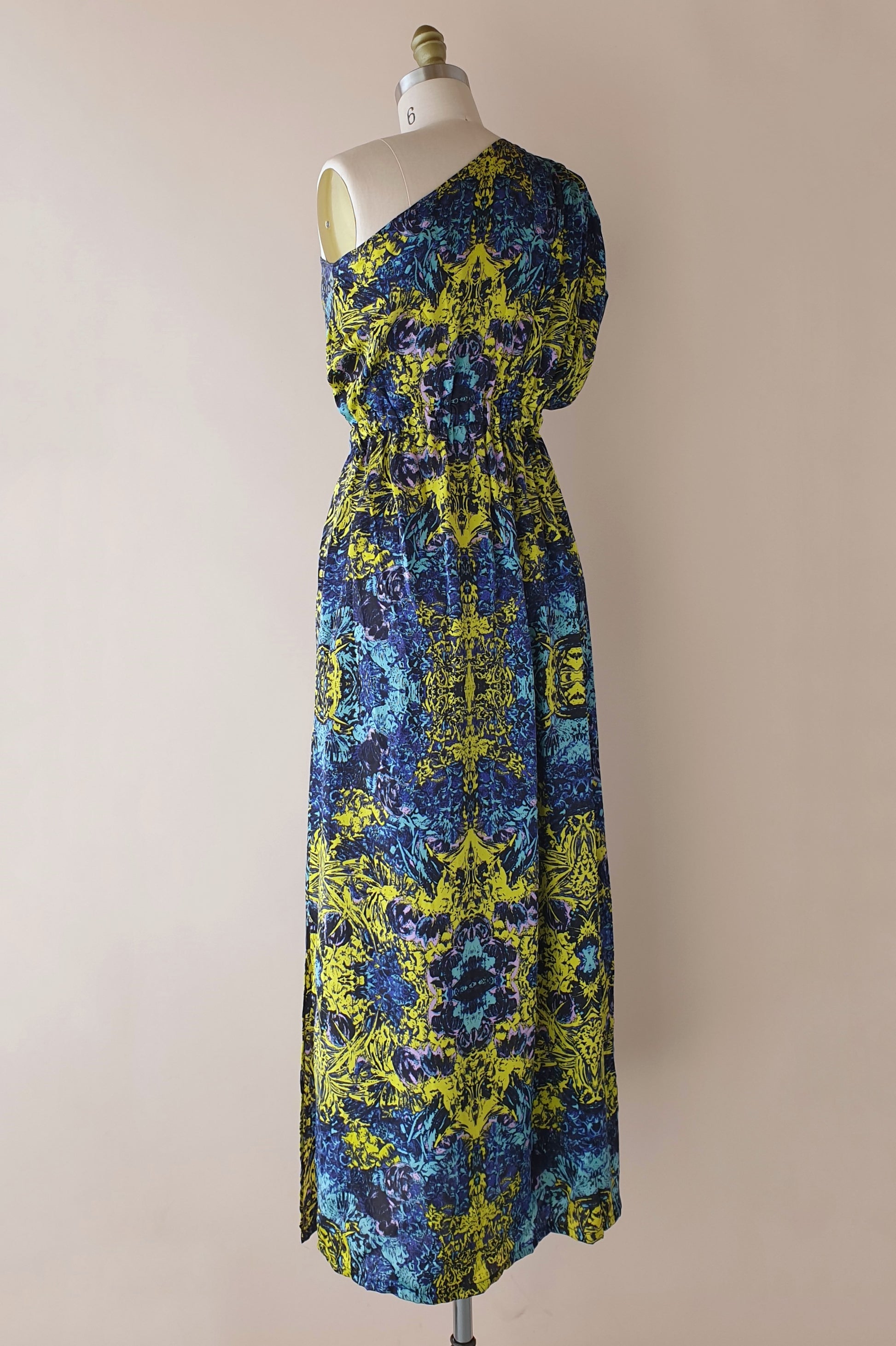 Gorgeous silk one shouldered maxi dress from 90's/00's label Vallen. Softly gathered at shoulder then gently cinched in just above the natural waistline with elastic and a drawstring. Maxi length with splits at either side. Barely there soft floaty silk fabric. Simply stunning!