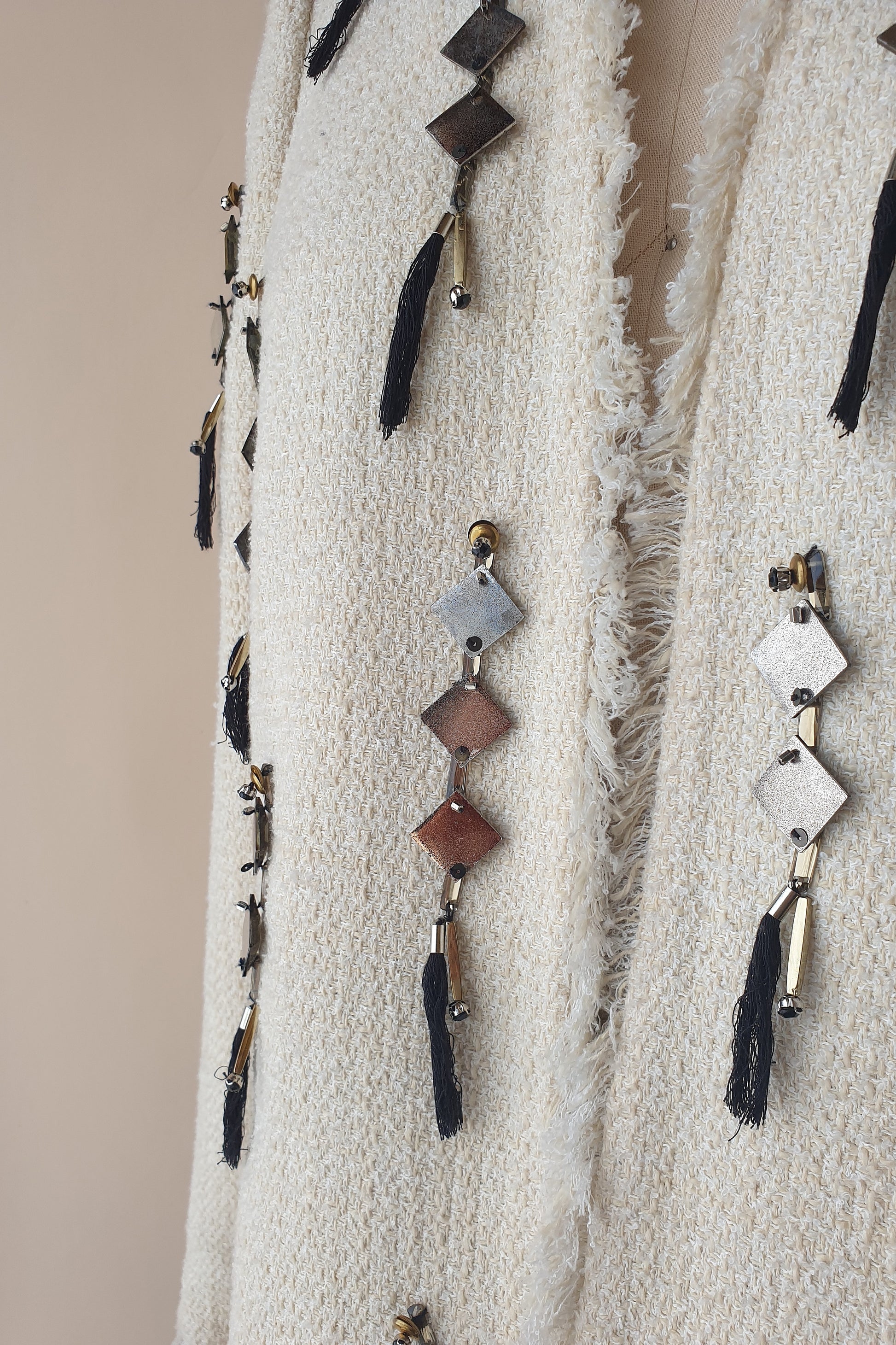 Simply stunning embellished jacket from Scandinavian label 'By Malene Birger'. Beautiful textured fabric adorned with tasseled embellishments. Two faux pockets at front, partially lined, no closure. An incredible addition to your Winter wardrobe!