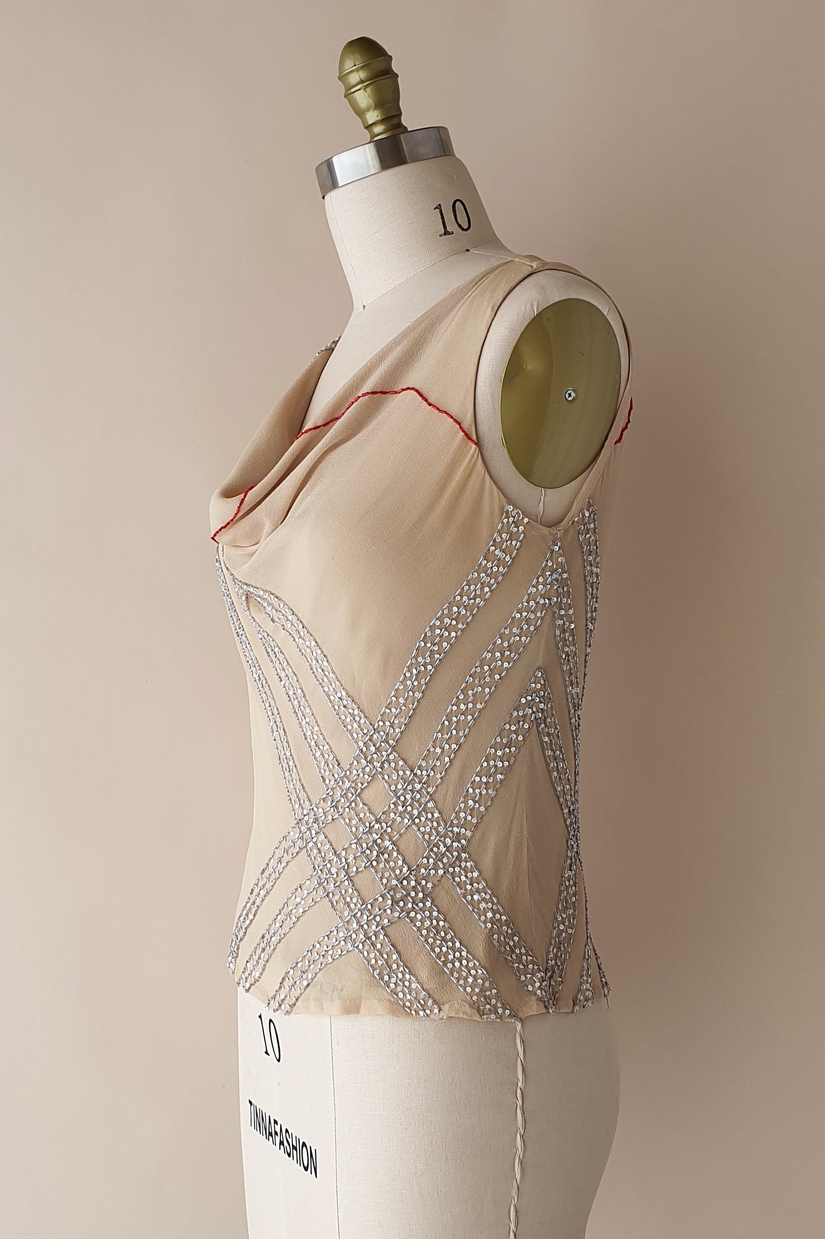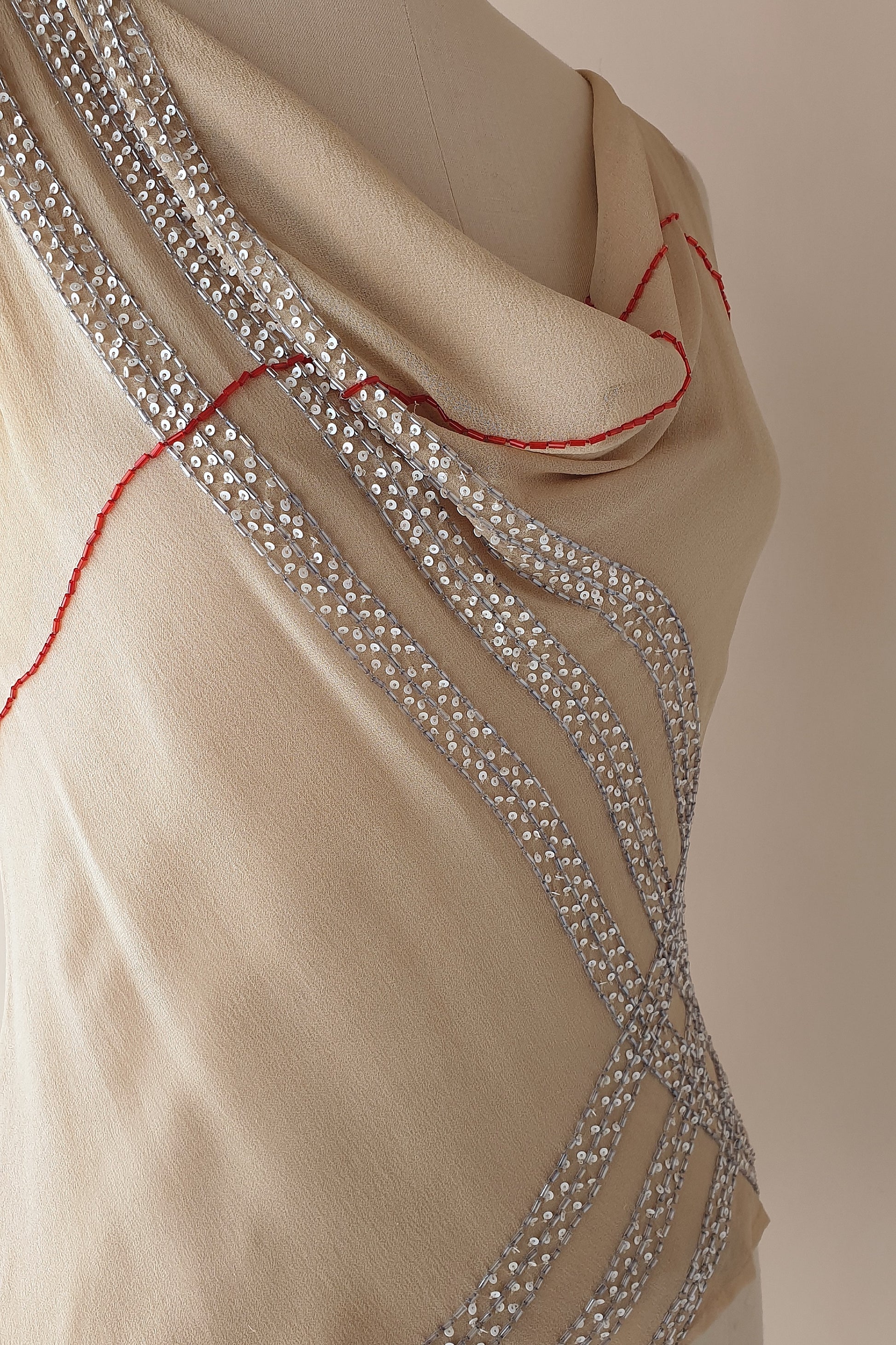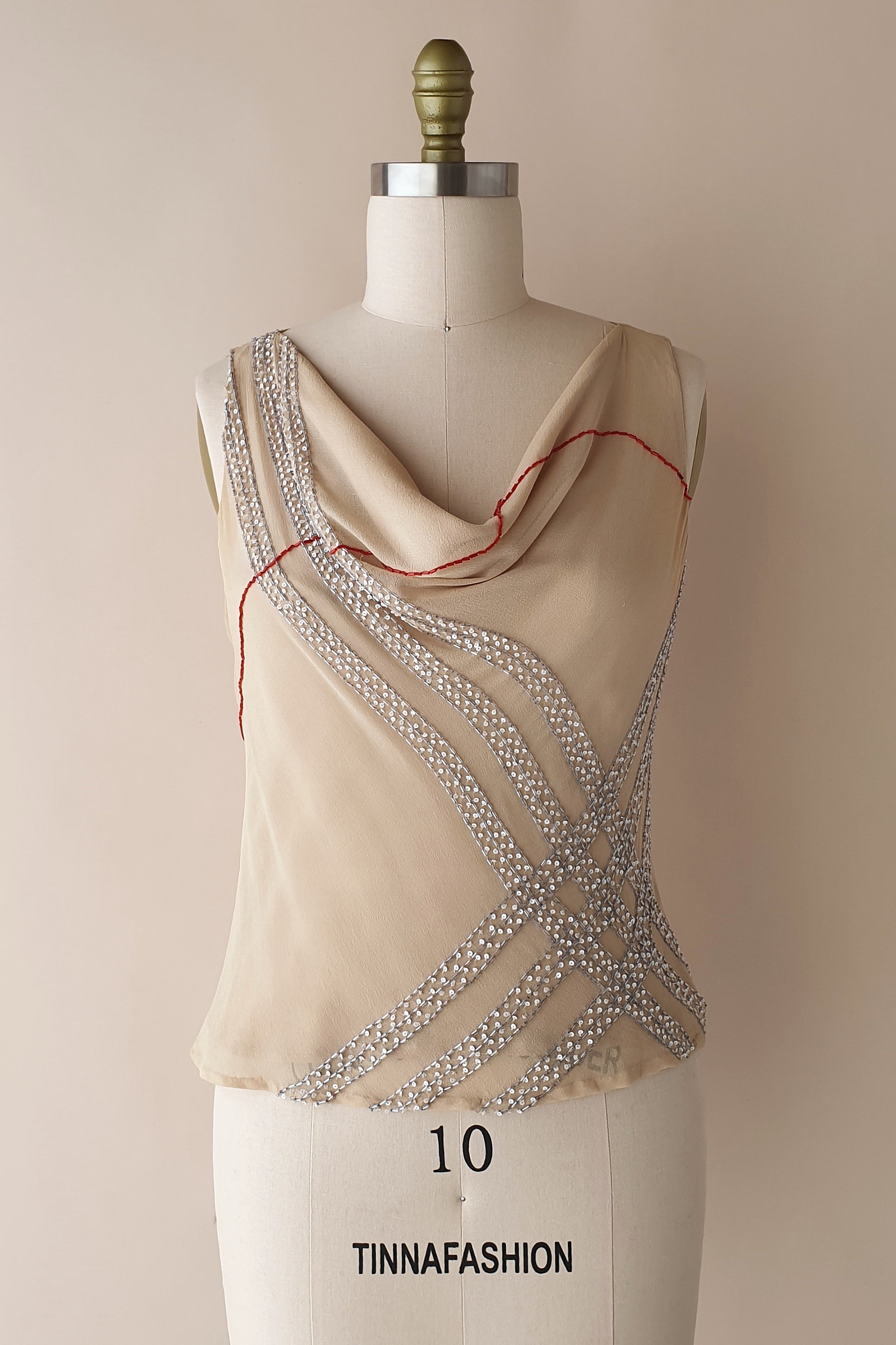 Beautiful fine silk Burberry top with bead and sequin embellishment. Featuring a cowl neckline and bias cut for a flattering fit. Lined with silk. Subtle glamour at its finest.