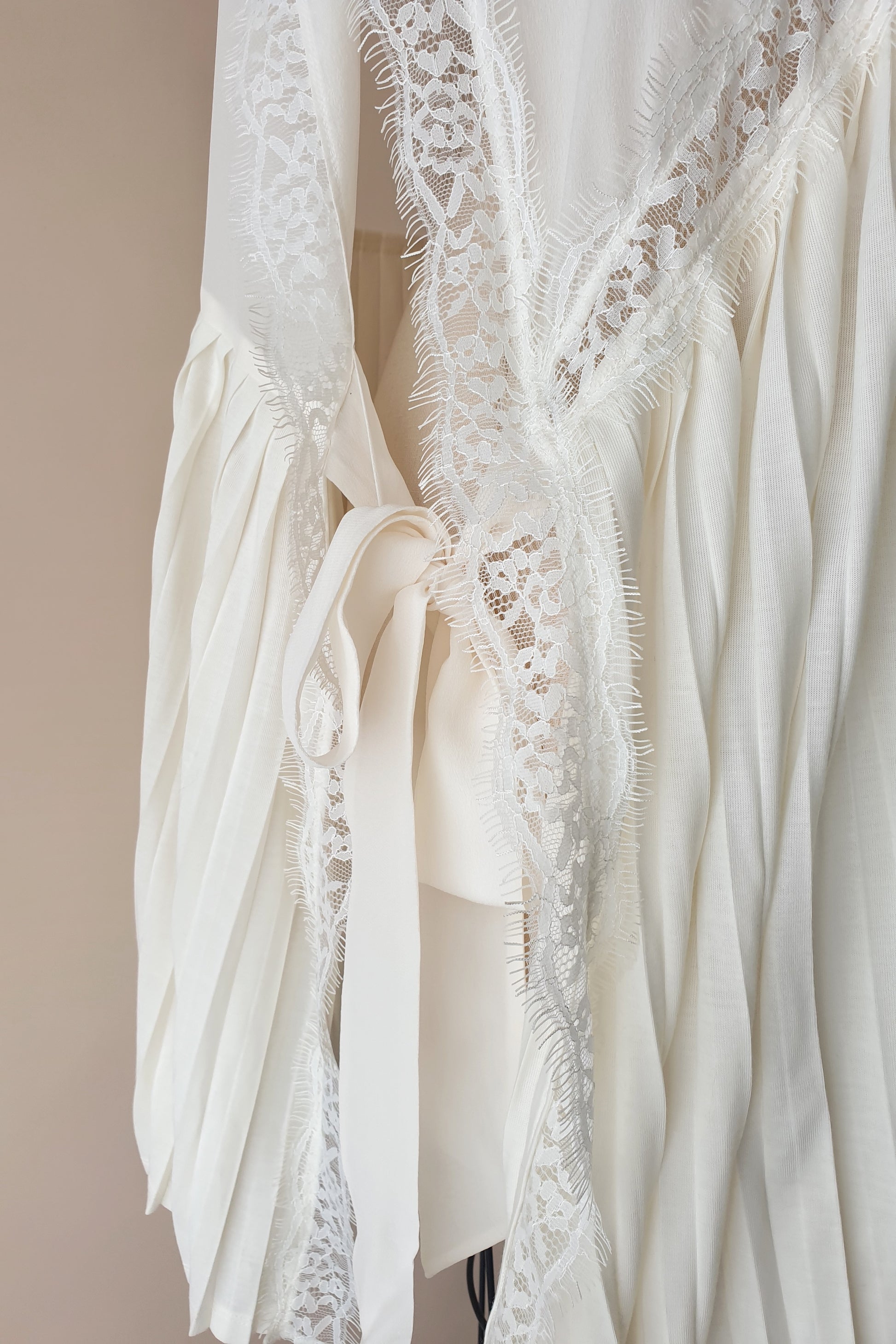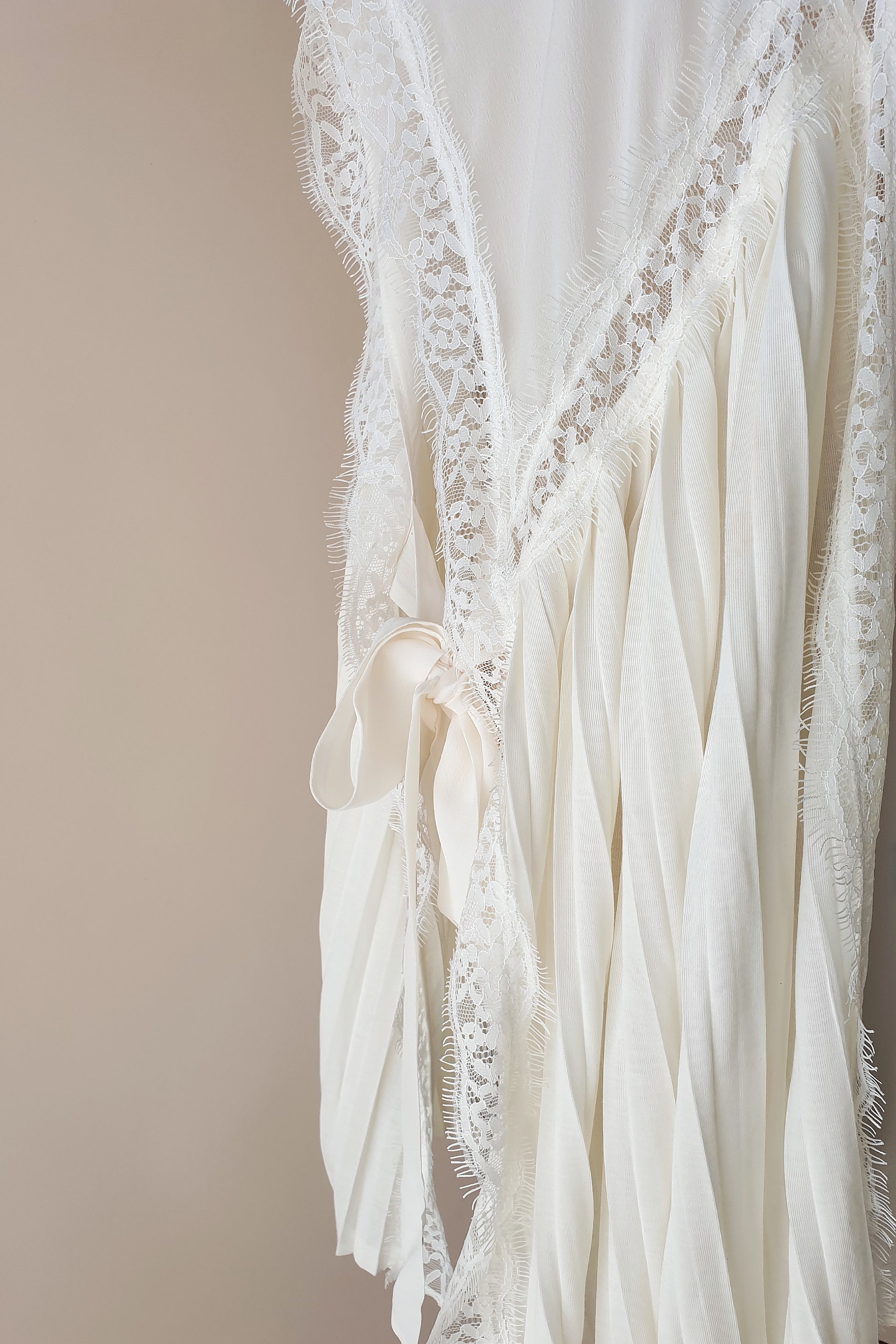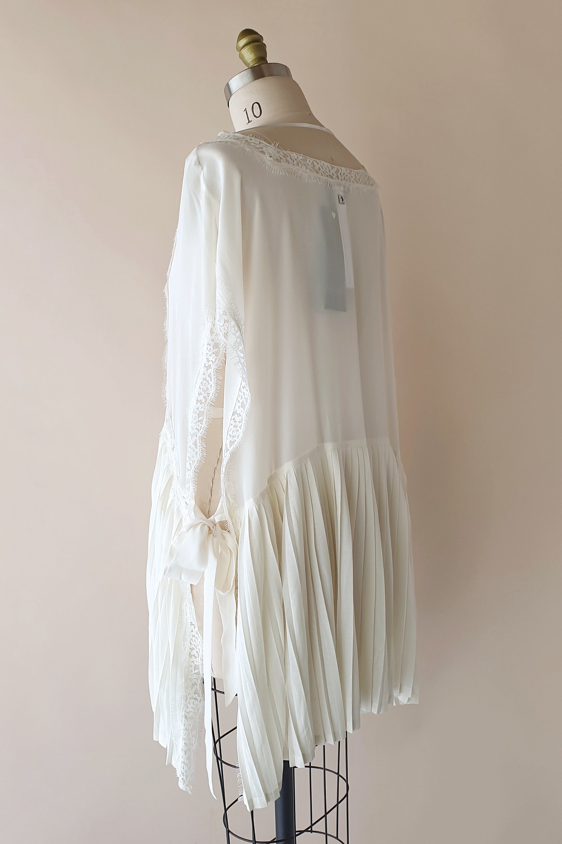 Beautiful ivory silk top from Italian label Twin set. Fabricated from a soft, sheer silk. Featuring silk ties at the side, lace trim and contrasting pleated panels. Wear over your swimsuit for poolside cocktails, or over a tank top and denim shorts for a romantic holiday look!