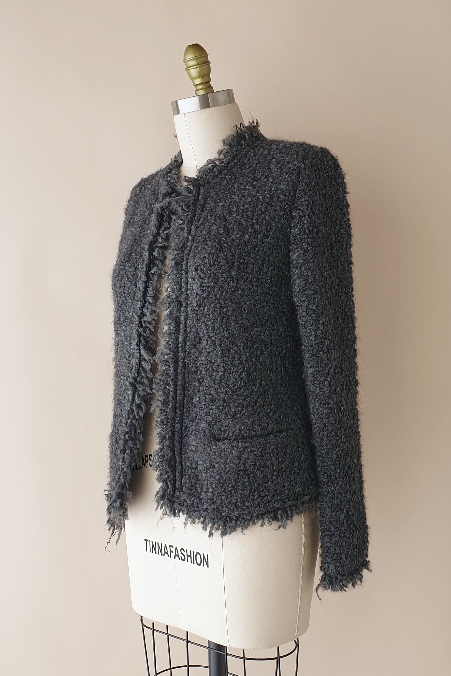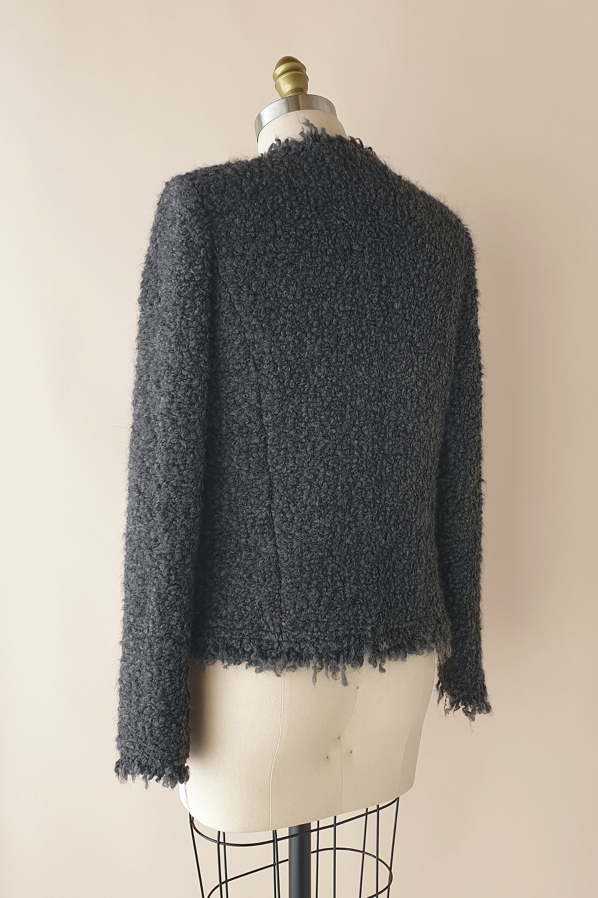 Stunning mid/dark grey wool blend boucle blazer style jacket from IRO. Two pockets at front, no closure, lightly padded shoulder. This jacket has all the comfort and cosiness of a knit with the structure and style of a blazer! Such a classic piece!