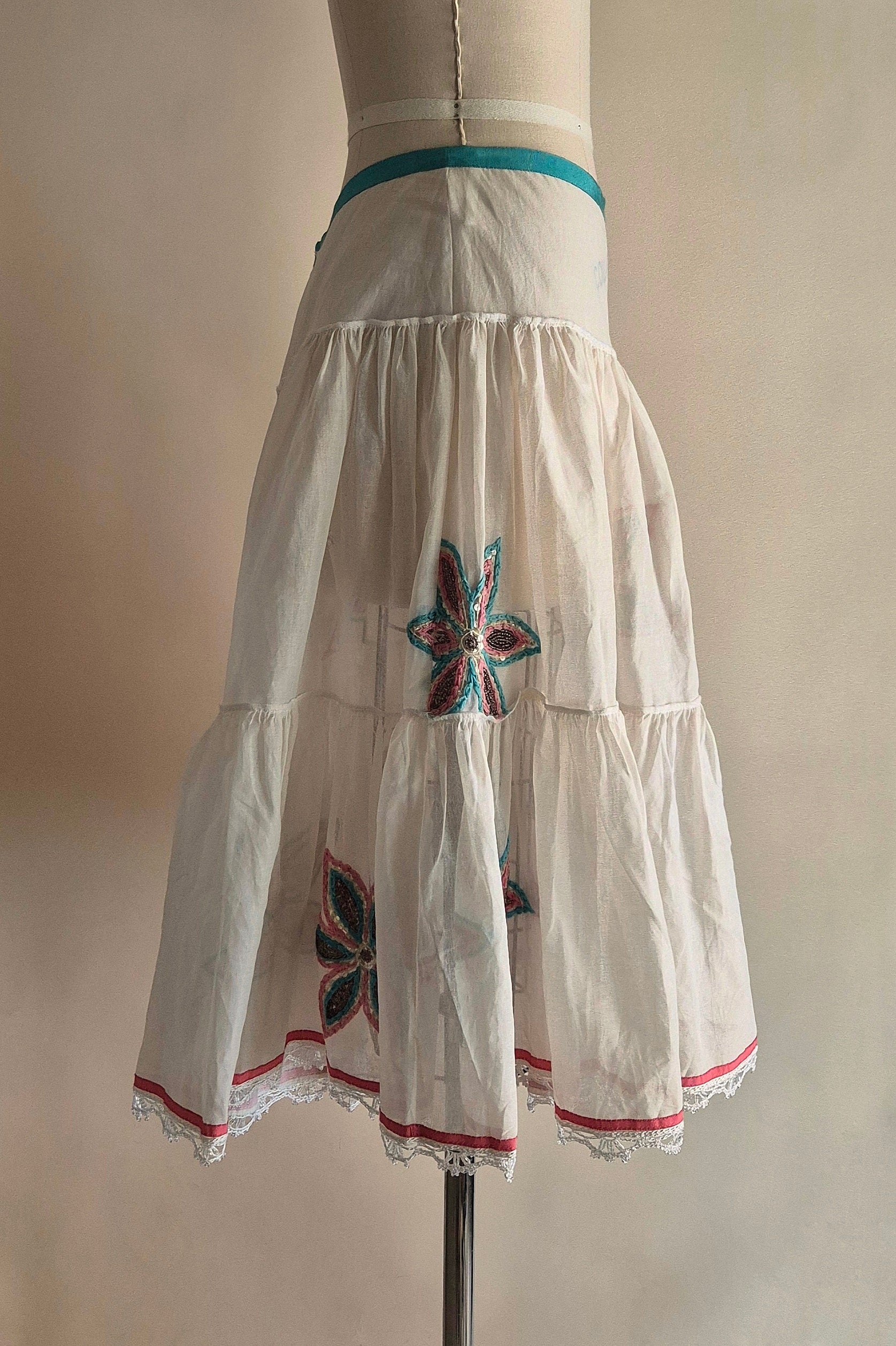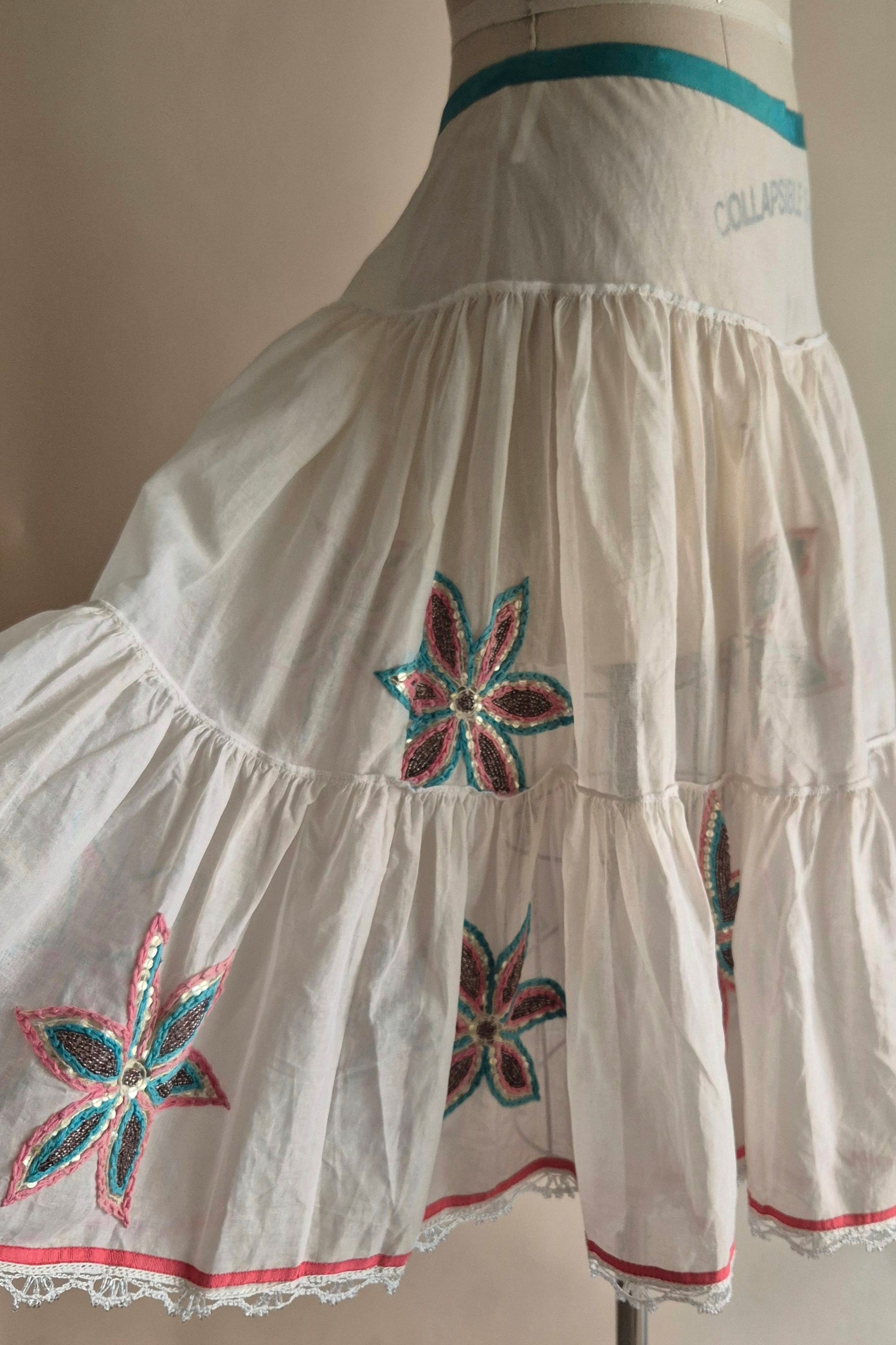 Elevate your wardrobe with this Trelise Cooper sheer embellished skirt. A beautiful statement piece that is seriously fun to wear. Crafted from a slightly stiff cotton, this skirt creates a sense of lightness and movement, making it the perfect choice for the party season. Featuring a fine grosgrain waistband and invisible side zip closure.