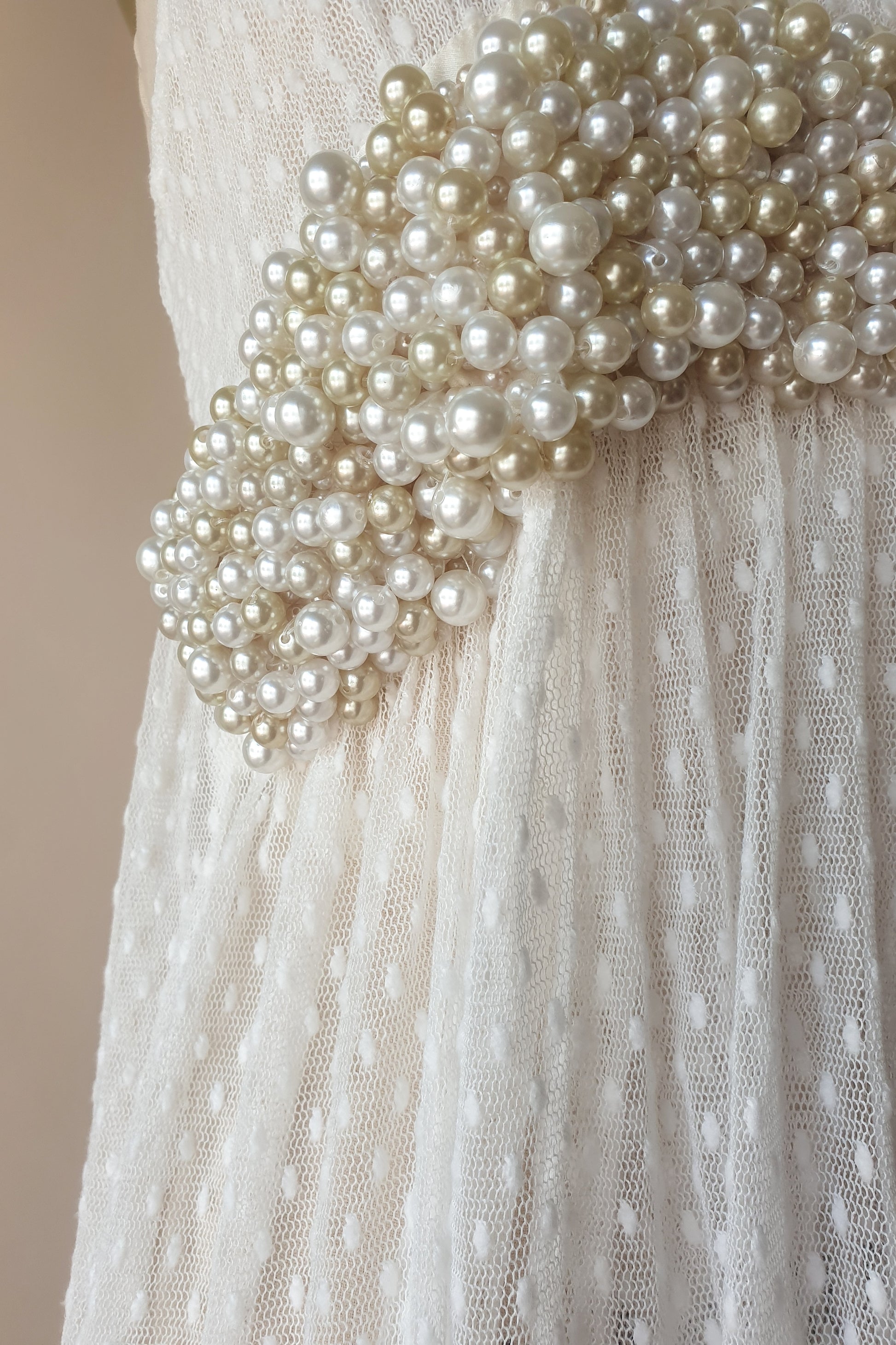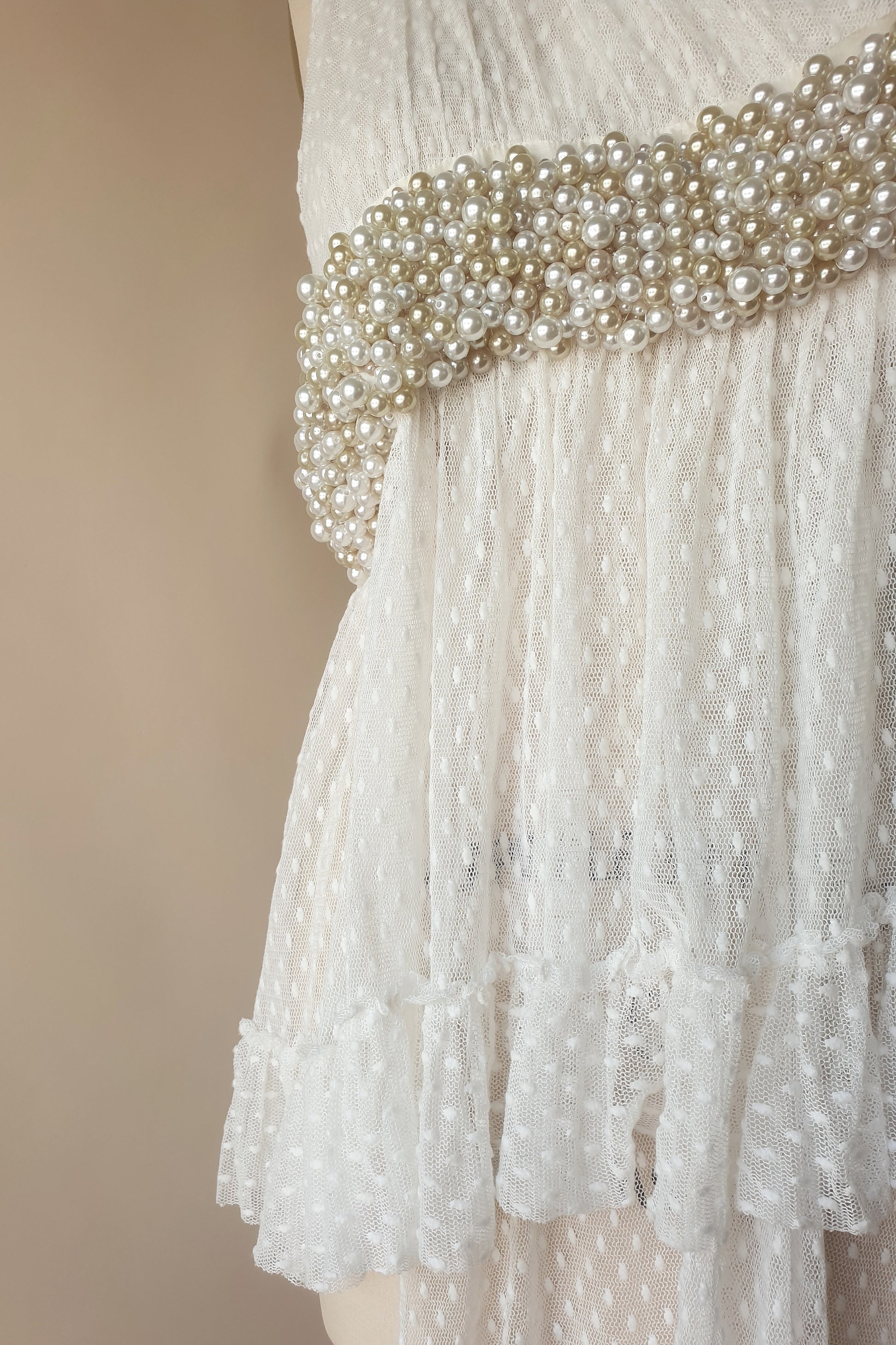 A wonderfully unique piece from Trelise Cooper! A soft, sheer mesh with a small dot pattern drapes across the body and falls into an asymmetric hem. Top is fastened by a press stud on the inside and outside forming a wrap style. Embellished by a swathe of pearls. Simply stunning!